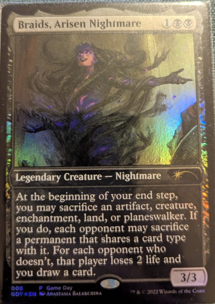 We also play several sacrifice effects. Cards like Braids, Arisen Nightmare allow us to sacrifice our vehicles at end of turn for advantage. As we control the order of triggers we can stack Braids effect to resolve before Greasefang bounces our vehicle back to hand, putting it back in the graveyard for next turn.
